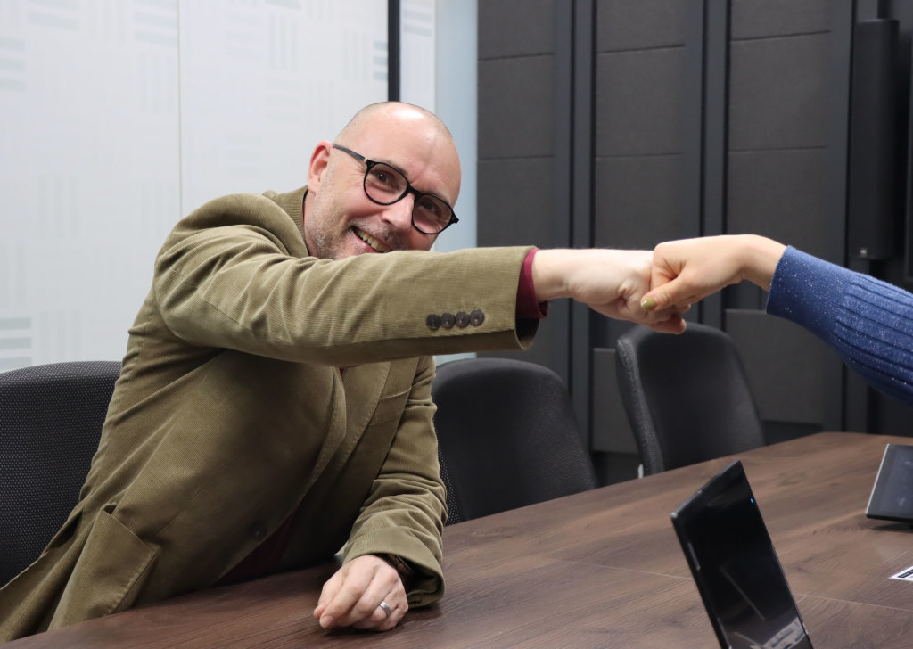インタビューの最後には、Sid Stanley氏と弊社スタッフの間で笑顔のフィストバンプ(拳を合わせる挨拶)が交わされ、CALRECとヒビノの親密な関係性が垣間見える温かな時間となりました。今後もCALRECとヒビノは、日本の放送文化の発展に寄与してまいります。