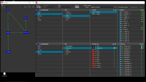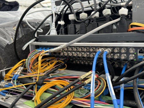 最大距離はVIP~BASE間の約300m。効率的なネットワーク構築により、迅速な設営と安定運用を実現しました。 各拠点は光ファイバーで接続されているため、急な信号の入出力の変更時にもソフトウェア上で設定変更を行うことができます。音声信号はSDI映像信号から自由にエンベデット/ディエンベデット可能で、こちらもソフトウェア上で切替できます。