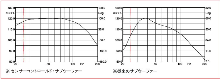 | ●正確な低域を出力するためマスク効果を激減させます。 従来のサブウーファーでは、過剰な低域が他音域に影響してかぶりやにごりなどの問題が生じていましたが、センサーコントロールド・サブウーファーはマスク効果を激減させ、明瞭度のある低域を出力します。 |