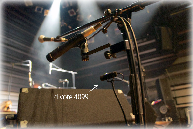 そうですね、まずアンビエントの収録にはリボンマイクをステレオで使用したのですが、撮影の関係で間隔を広めにセッティングしなければならなかった為、センターイメージのフォローが必要になってきます。もちろん、極力カメラにマイクが写りこまない様なセッティングが求められ、アニャンゴの正面に立てられるマイクスタンドは1本のみという厳しい制限がありました。そこで思いついたのが、コンパクトで目立ちにくいd:vote楽器用マイクVO4099U(超単一指向性)とd:screetミニチュアSC4060をマイクスタンドに取り付けるという方法です(SC4060には塩田さん自作の針金を使ったアタッチメントを使用)。この他にも、目立たないようにステージモニターの真横にショットガンマイク4017Bをステレオで仕込み、ボーカルとニャティティをフォローしています。この3つのマイクで録っておけば、センターイメージは後からどうにでも作れるだろうと思っていましたが、イメージ通りに音像を収録することができました。バイオリンとコントラバスにはPA用としてd:vote楽器用マイクVO4099Bを付属のクリップで仕込んでいましたが、これらもミックスにも十分使えるクオリティで録ることができました。