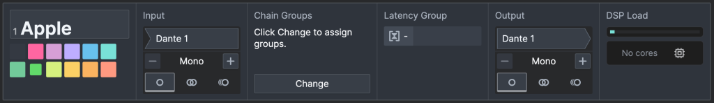 アウトプットにパッチされるチャンネルと、chainの「幅」(オーディオを何チャンネル含むか)を設定できます。オプションは Mono 、Stereo 、Multi 。一方、Multiは最大64のオーディオチャンネルを含むchainを設定でき、サラウンドサウンドプラグインに便利です。