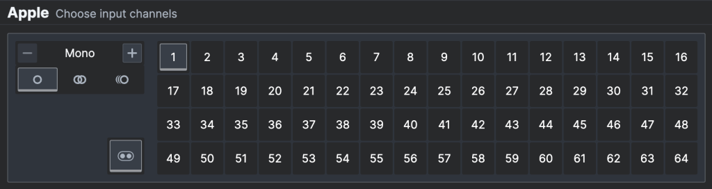これにより、使用するチャンネルを選択することができます。デフォルトでは、パッチされたチャンネルは常に1つの連続したブロックにまとめられますが、任意のチャンネルを選択したい場合は、"group channels" ボタンを切り替えます: