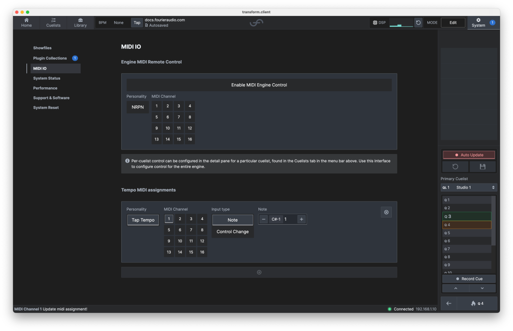 システム表示区画のMIDI IOタブでは、transform.engin
