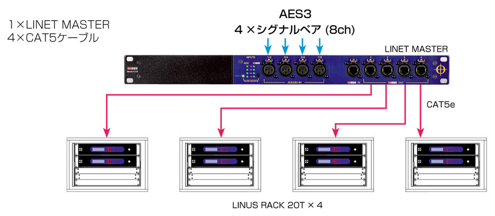 | ・CAT5ケーブルですべてのLINUSアンプとラックと接続可能 |