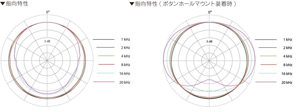 | 周波数レンジ(±2dB) | 20Hz~20kHz(3dBソフトブースト@5~20kHz) ボタンホールマウント装着時:20Hz~18kHz (7dBソフトブースト@5~18kHz) |