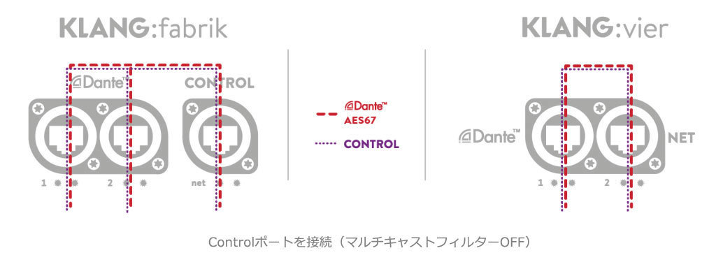 DanteネットワークとWi-Fiルーターをネットワーク接続する場合は、マルチキャストフィルターを有効にすることを強くお勧めします。例えば、Wi-FiルーターをKLANG:fabrikまたはKLANG:vierに直接接続したい場合はControlポートを使用し、モードを「Switched, separate Control」または「Switched, with Multicast filtered Control」に設定します。
